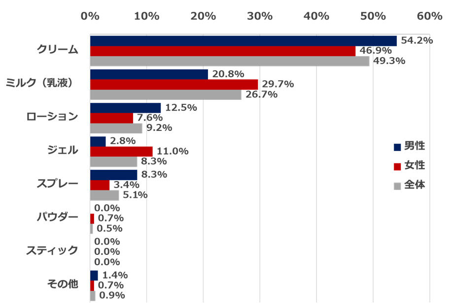 男性54.2%、女性46.9%と「クリーム」タイプを使用している人がともに多く、その他では「ミルク(乳液)」タイプが男性20.8%。女性29.7%と多い結果でした。逆に「パウダー」タイプは男性0%、女性0.7%、「スティック」タイプは男女ともに0.0%でした。皮膚1cm2ni対して2mgという必要量を塗ることができるといわれる形状のものを使用している人が多い結果でした。