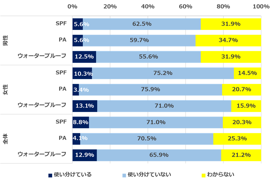 前項目まで普段主に使用する日焼け止め(サンスクリーン剤)について伺いましたが、この主となる日焼け止め(サンスクリーン剤)以外の日焼け止め(サンスクリーン剤)は、何を基準に使い分けているかを伺いました。「ウォータープルーフ」が男性12.5%、女性13.1%と多い状況でしたが、「SPF」「PA」「ウォータープルーフ」ともに「使い分けていない」という人が全体で65.9%~71.0%一番多い結果でした。