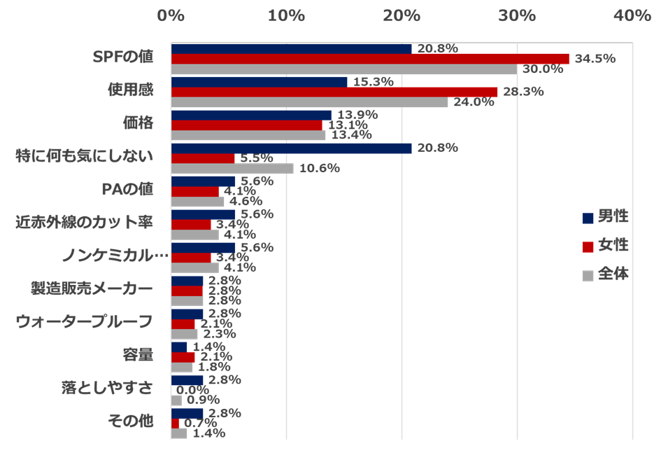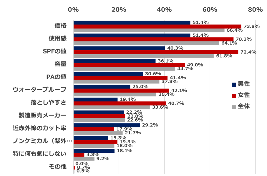 その他、日焼け止め(サンスクリーン剤)を買う時に気にしているものは、女性では「価格」73.8%、「使用感」70.3%、「SPFの値」72.4%が高く、男性では「価格」「使用感」がともに51.4%と高い状況でした。日常的に使うものだからこそ継続できるものが重視されている結果でした。