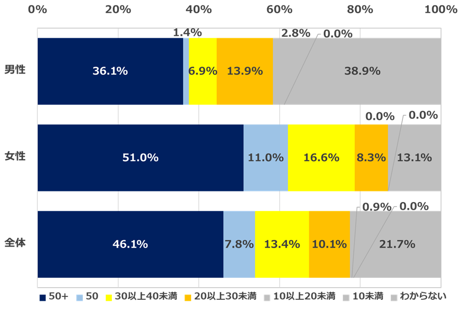 また普段使用している日焼け止め(サンスクリーン剤)のSPF値についても伺いました。女性では「50+」が51.0%と多く、男性では「わからない」が38.9%と多い状況でした。