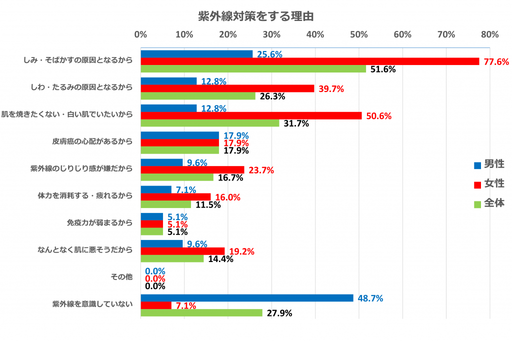 「皮膚癌の心配があるから」「免疫力が弱まるから」といった疾病に関わる理由には、性別による差がないことが解りました。