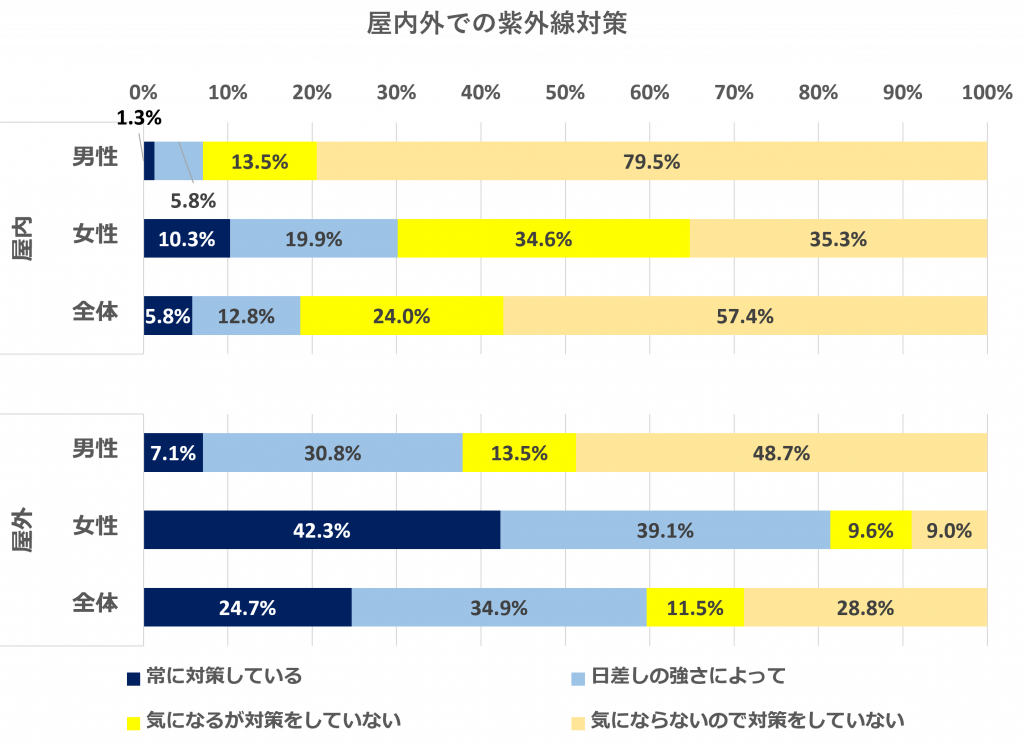 屋内でも紫外線対策を「常にする」もしくは「日差しの強さによって」すると回答したのは男性7.1%、女性30.2%でした。