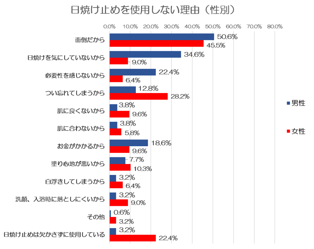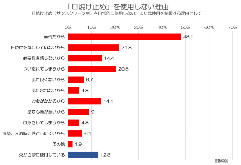 「日焼け止めを日常的に使用しない理由」について、「面倒だから」と回答した人が48.1%と最も多く、「日焼けを気にしていないから」と回答した人も21.8%もいました。