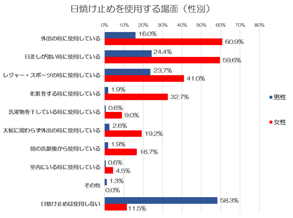 「日焼け止め」を使用する場面について、男性の6割近くが「日焼け止めを使用しない」と回答しています。男性の「光老化」に対する意識の低さが顕著に現れました。