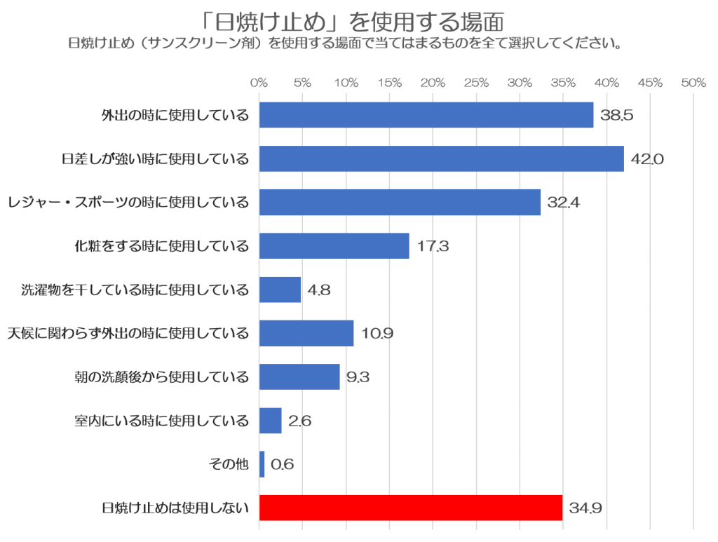 「日焼け止め」を使用する場面について、「外出時」「日差しが強い時」「レジャー・スポーツの時」と回答した人が3割から4割でした。一方で3割以上の人が「日焼け止めは使用しない」と回答しています。日常的の日焼け止めを使用するようにしている人はまだまだ少数であることが伺えます。